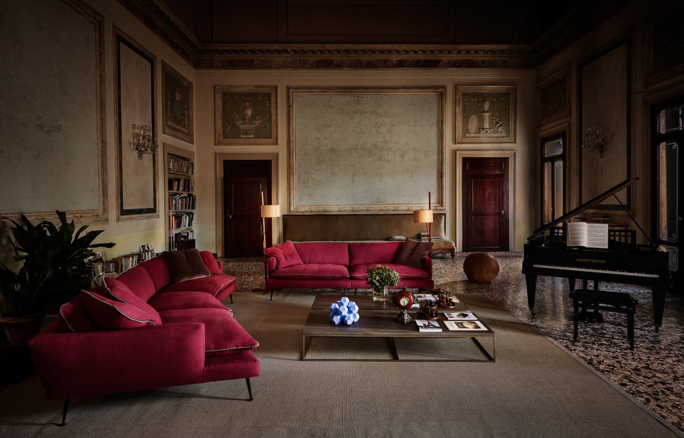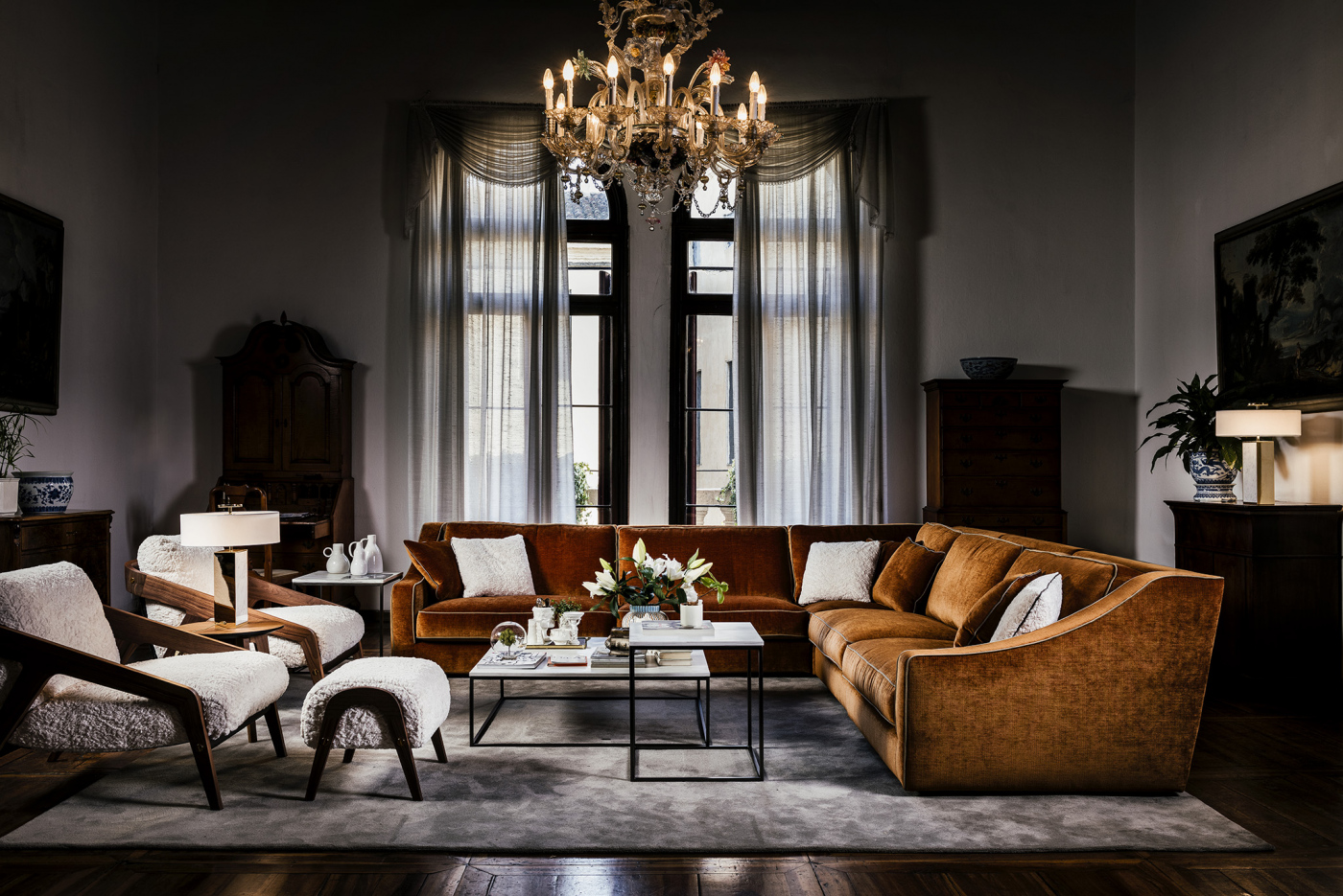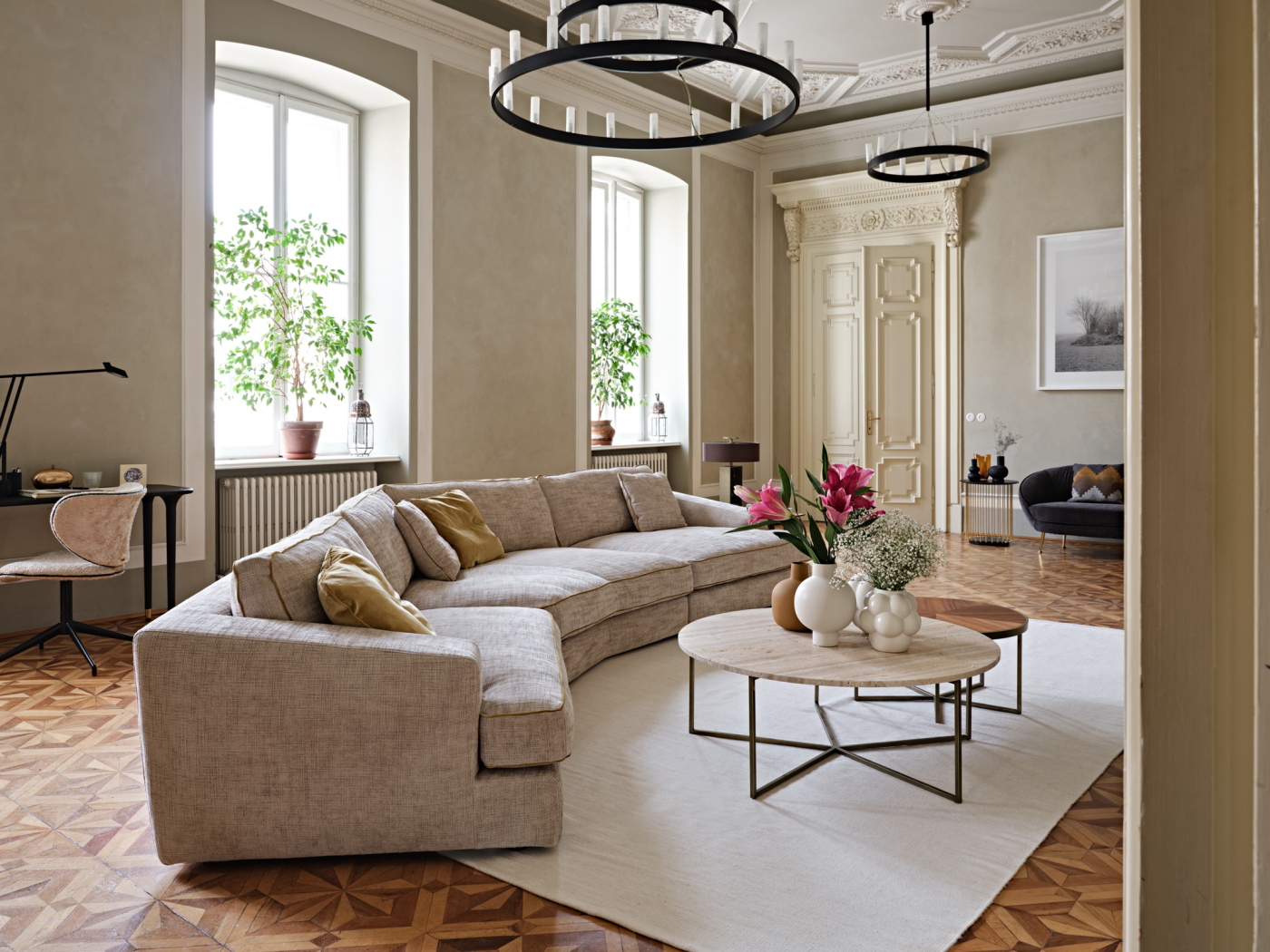 Un divano componibile dalle forme avvolgenti e sinuose: Erasmo è una sintesi perfetta di linee classiche e moderne, poste in elegante evidenza dalla cordonatura del bracciolo che sa accompagnare con discrezione la composizione. La morbidezza dei tessuti accoglie la seduta, resa ancor più invitante dalla forma delicatamente curva, che abbraccia le più intime conversazioni.