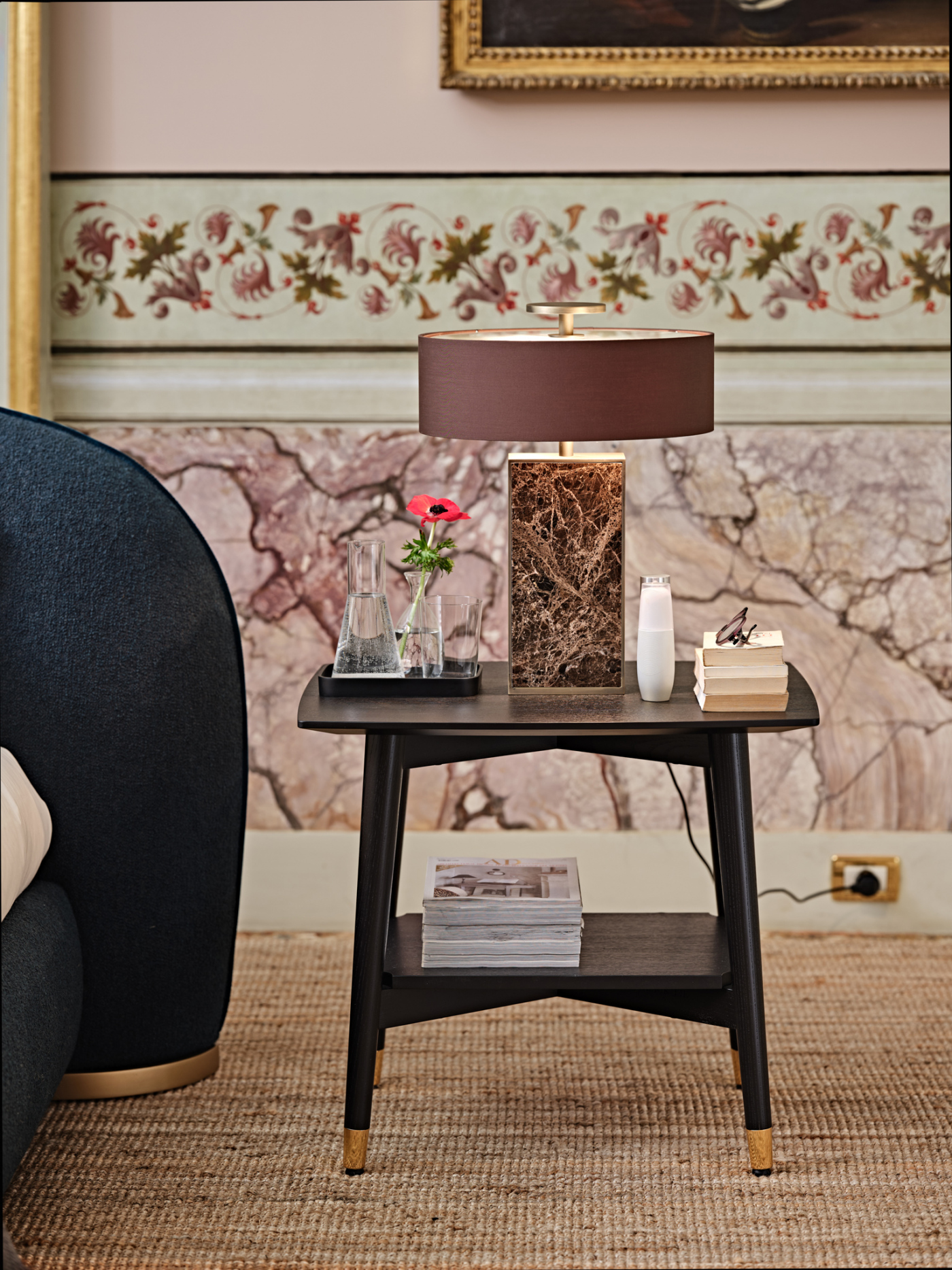 L’essenza dei particolari: Alfio è la sintesi dell’esperienza BlackTie nel creare complementi d’arredo che sanno essere discreti protagonisti di eleganza senza tempo. La semplice iconicità delle forme, che dialogano sinuosamente con l’ambiente notte; il prezioso dettaglio della finitura oro lucido o bronzo scuro opaco dei puntali, che conferisce una firma di stile, sussurrata quanto degna di riguardo.
