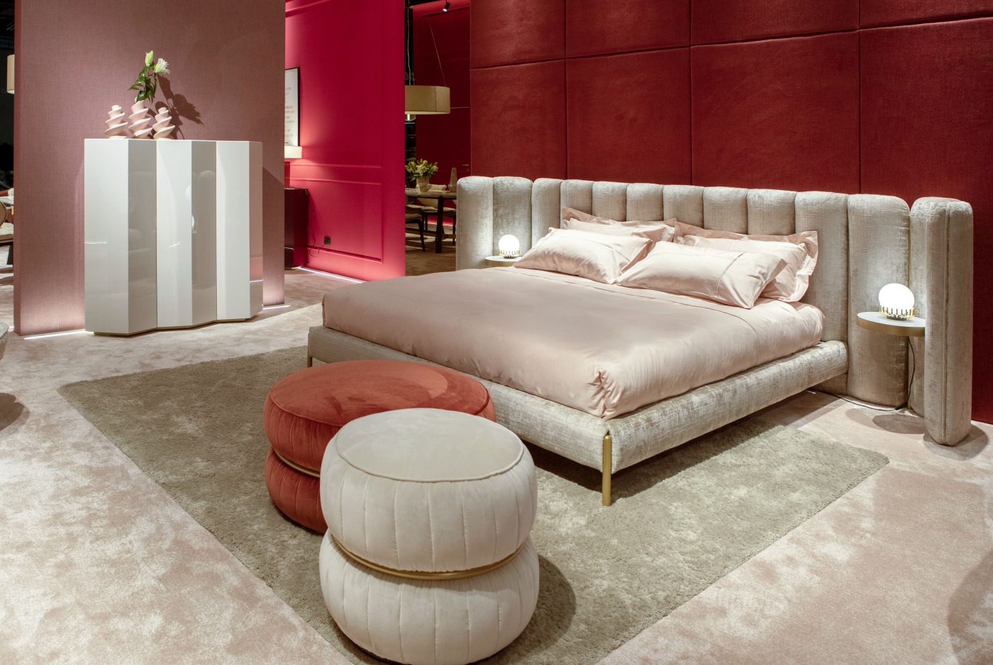 L’eleganza Black Tie entra nella stanza più intima e segreta della casa: il letto Ibisco, con la sua testiera morbidamente scultorea, è un elemento raffinato e rigoroso che sa dialogare con silenziosa maestosità con gli altri elementi della stanza. L’oro opaco incornicia con discrezione i particolari delle linee e dell’intelligente sistema di comodino integrato, che nasconde nel piccolo cassetto rotante i più preziosi segreti. La finitura del top in vetro retro laccato si armonizza al tessuto della testiera, in contrasto o accordo, second